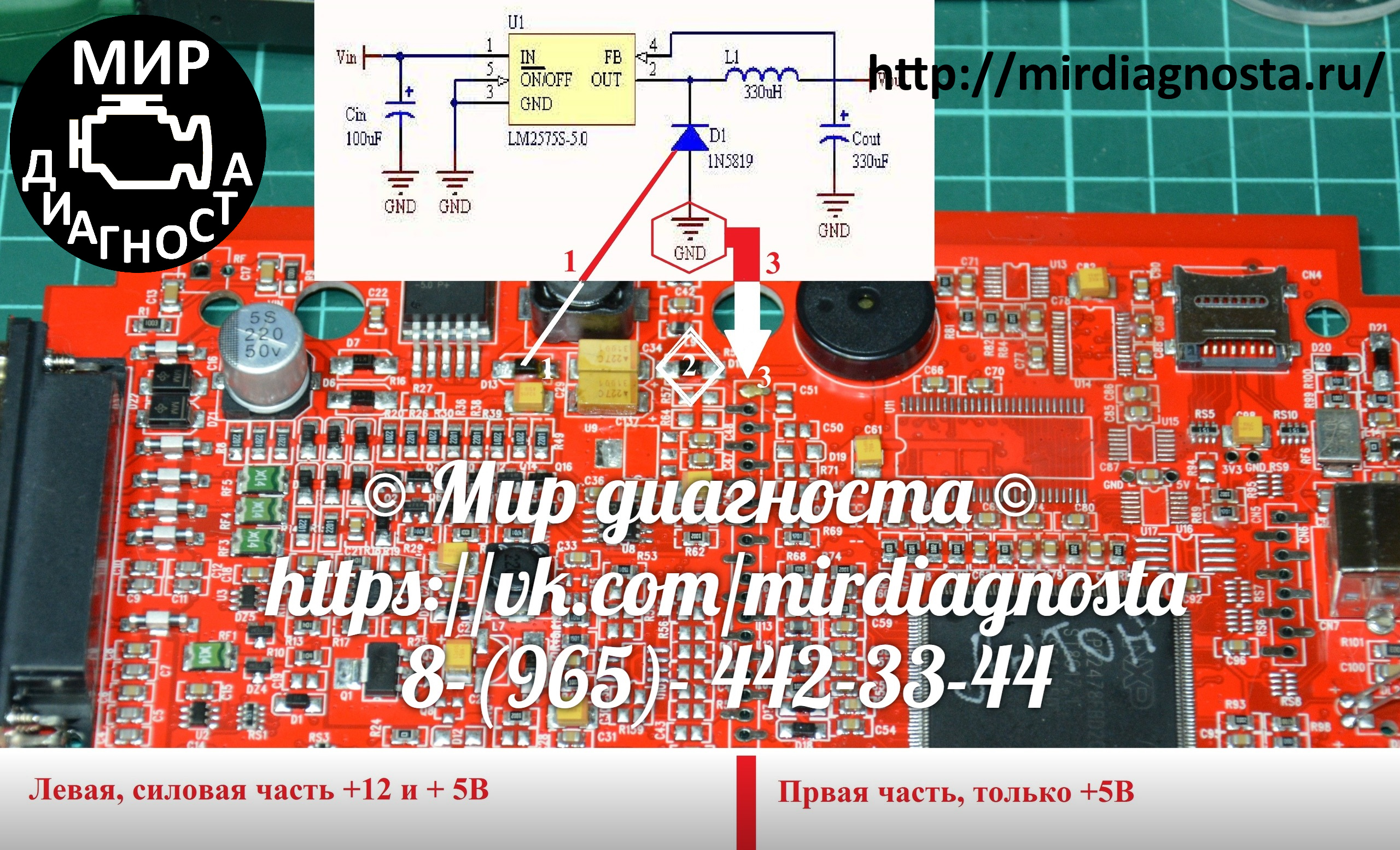 1. Не контакт металлизации в отверстии 3 (первый сверху).Нет массы на аноде диода = Uвх=Uвых = 12В ушло на микросхемы вместо +5В